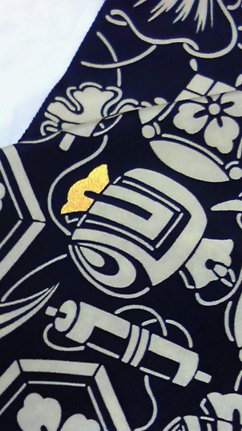 大きな宝尽くしが印象的な小紋です。古典柄である宝尽くしですが、大胆に配すことによって、とてもモダンにお召いただける着物になりました。色は、写真では紺っぽく見えますが、もっと深みのある色で、どちらかと言うと墨色のような感じでしょうか?