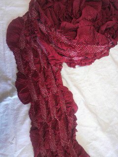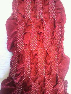 この襦袢は、こうやって染め上ってくるまで1年がかりなんです。絞るのに時間がかかっているのはもちろんの事。生地は何にするのか、どんな模様で絞るか、色はなにいろにするのかと、とってもこだわってつくりました。