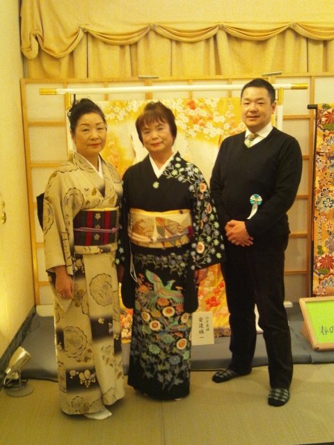 、素敵なお着物姿を店長さんと一緒にパチリです!それぞれ、辻が花のお着物と加賀友禅の訪問着をお召しです。お二人とも華やかなお着物をお召しになってお出掛けいただいたので、会場内では注目の的で、視線集中でした!