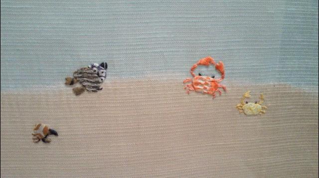 古布で作られた灯台や気球、とおくに飛び立つ飛行機も見えますね。私のおすすめは、浜辺のヤドカリ君とカニさんです!赤いカニさんの微妙な色の加減は本物のようですよ。