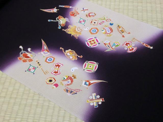 円窓取りの中心に宝袋、その中からたくさんの宝物が飛び出した宝尽くし模様です。重めの友禅で仕上げているので、華やかさもあり普段着はもちろん、付け下げくらいまで合わせて頂ける、使い勝手のいい一本です。