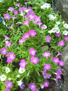 サフィニアというお花です。植えた時は苗と苗の間に隙間がありましたが今は隙間なくサフィニアで埋め尽くされています。