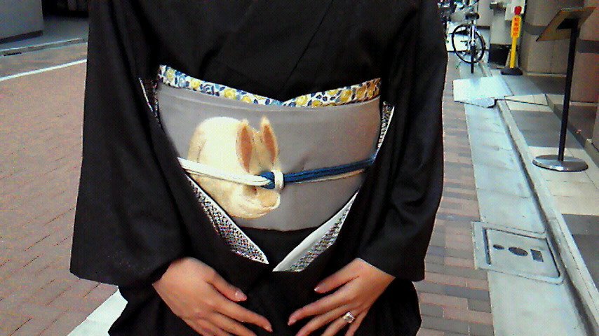 黒地に大きな櫻柄が印象的なお着物にうさぎ柄の名古屋帯を締めていらっしゃいます。羽織は力のある刺繍が豪華です。