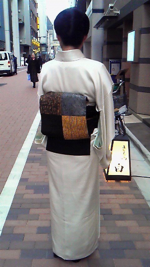 こんな寒い日には結城紬がいいですね。絵絣が上品な素敵なお召し物です。帯は、網干に梅の新春にぴったりのお洒落なコーディネートですね。