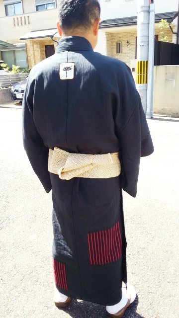 後姿のポイントは、飾り紋のアップリケのとんぼさんです。こういう遊び方は、夏ならではですね。このアップリケ紋は、色々な柄があって、女性の方のお着物に付けて頂いても可愛いです。帯は芭蕉のざっくり感たっぷりの角帯です。