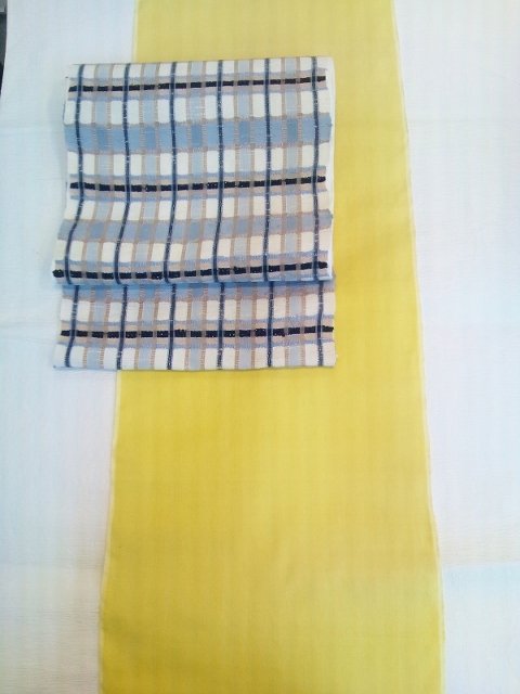 1本目の帯は、隼人紬工房のモダンな吉野間道の名古屋帯です。2本目は両脇に無地がくる光流帯の中のアルザス卍文の染名古屋帯です。