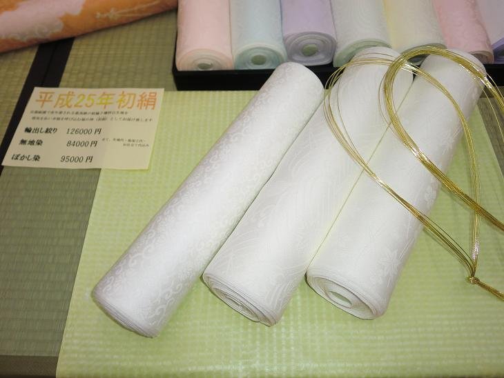 新年と言えば“初絹”厄を払い、福を呼び込み今年一年が良い一年となると言われています。今までは、お着物用の白生地をご用意していましたが、今年は初めて襦袢用のとっても素敵な白生地をご用意してみました。菊唐草、波に吹き寄せ、吹き寄せと三タイプの地紋の物をご用意しています。