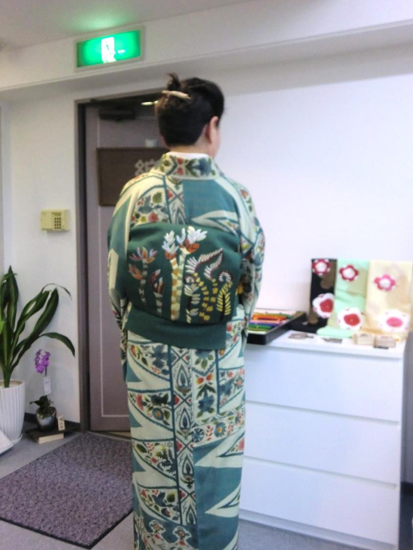 撮影成功したこのお客様は、踊りのお稽古の帰りにお寄りいただきました。このお着物には、シルクロード。帯にはめぶきと名前を付けられていつそうですよ。