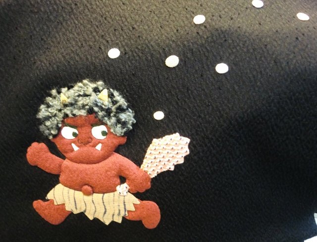 こんな節分の帯もあるんですよ!ぷっくりアップリケの鬼さんがかわいい名古屋帯です。前柄には福豆が!!年齢の数だけ食べて、しっかり厄払いをしなくちゃですね。