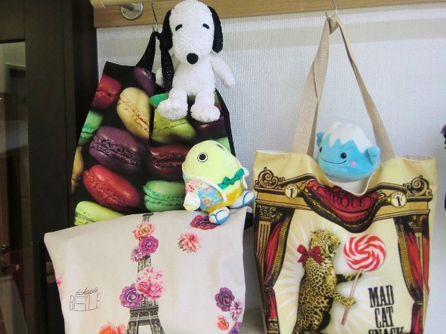 今日、みんなのおもちゃになったのは、フランス製のおしゃれなバッグです。マカロン!エッフェル塔!そして、インパクト大のヒョウ!!どれも、フランスならではの色使いでおしゃれです。