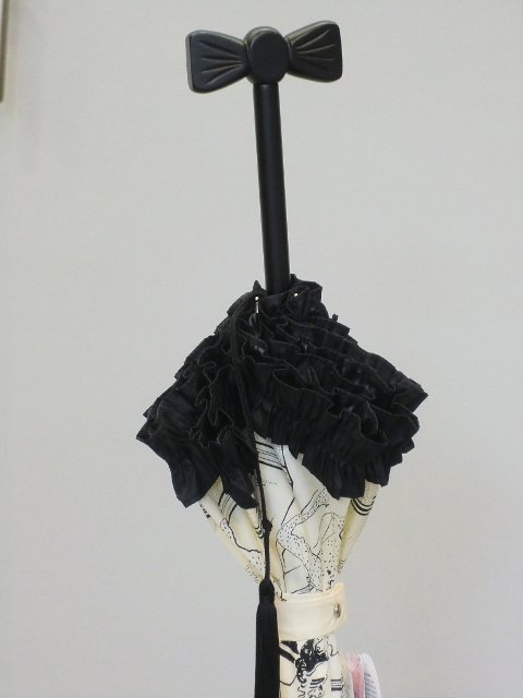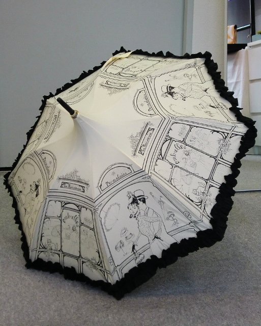 お洒落なフランスの街並みをウィンドウショッピングしているような気分になれる素敵なプリントの傘です。縁のフリルもポイントです!