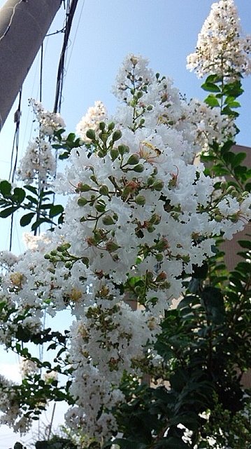 夕方にどしゃ降りになるとは思えないくらいいいお天気の中出かけた朝のプーさんぽから届いた写真は、ふわふわっと白いドレスのよう見える可愛らしいさるすべりです。