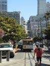 まずは、乗る前の路面電車の前でパチリ!この電車に揺られること30分で、フィッシャーマンズワーフに到着。プーさん店長さんの指の先(坂の上のずーっと先)から、路面電車に乗って来たんですよ。