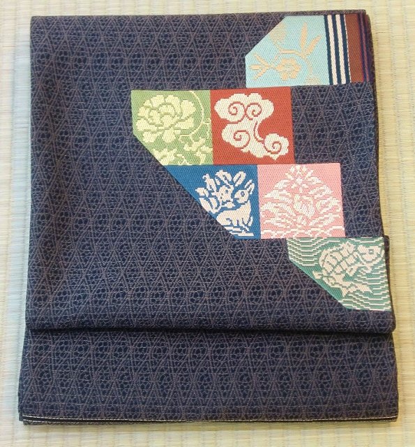 この帯は、おとといご紹介した、羅匠錦地なので、とても軽く締めやすい帯です。絽刺しは、花兎、荒磯、笹蔓、間道など名物裂の模様が並びます。