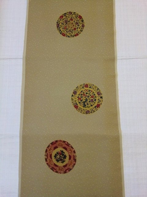カフェオレ色の地色に、伊万里の絵皿の柄の絵羽輪奈ビロードコートです。この輪奈ビロードは、あられの地紋が織り込まれています。2枚目の写真は背中です。絵羽付けになっているので背中心部分の柄がはつながります☆