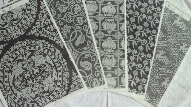 柄は、色々なものがあり名物裂で見られる有栖川文様や笹蔓文様、正倉院文様に見られる葡萄唐草や狩猟文などおおくの柄があります。色は、赤、紺、茶、緑と4色でご用意しております。