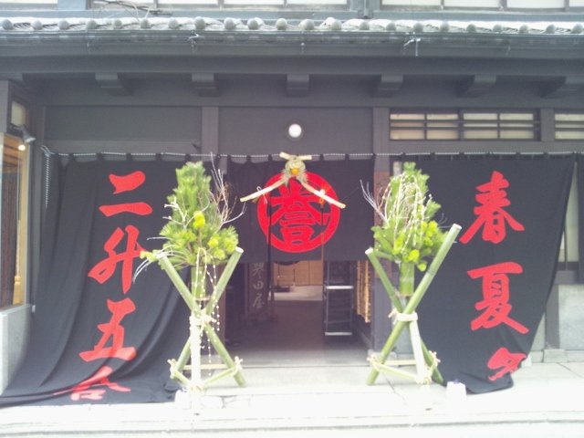 まずは、入口!!黒地に赤の大きな丸に“譽”の字が並んだ独特の店構えに、おおきな“春夏冬”と“二升五合”の文字と竹のお正月飾りが目を引きます。皆様は、この字の意味お分かりになりますか?