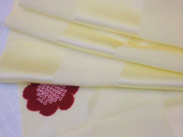 その襦袢生地を絞っていただきました。やさしいクリーム色地に赤いお花がとても可愛らしいです。仕立て上げると袖口と振りの部分に、ちゃんとお花が出るように位置を考えてしぼってあります。