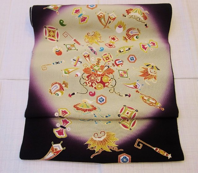 丸窓のようにほわっとぼかした所に、宝袋からたくさんの宝物が飛び出している幸せいっぱいの可愛らしく上品な名古屋帯です。