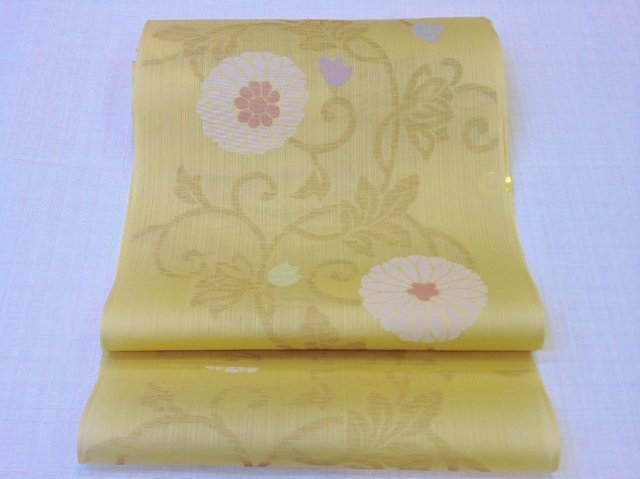 現在開催中の第二回『帯屋捨松展』から素敵な夏名古屋帯をご紹介します☆菊唐草柄のこの夏名古屋帯は、黄色の地色に大きめの菊唐草が織り出されています。まあるく文様化された菊なので、とてもかわいらしく色々なお着物に合わせてお使いいただけます。