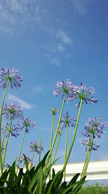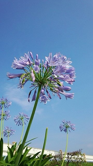 お散歩をピッカピッカお天気、雨降り関係なく出かけますよ。今日届いた写真は2週間ぐらい前にも届いたアガパンサスです♪前日の時はまだ全体的につぼみな感じでしたが、今日は満開!!青空に向かってすくっと立って、綺麗なお花を咲かせていますね。
