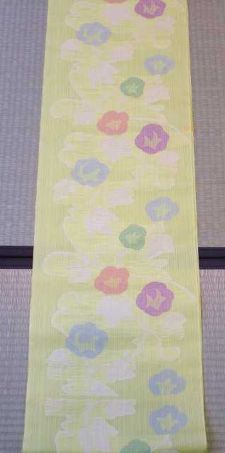 帯屋捨松のつる朝顔文夏名古屋帯です。きれいな黄色の地色に色とりどりの朝顔が咲いていて、とても可愛らしく爽やかな夏帯です。白芯を入れると透け感が出て、より涼やかさが増しますよ♪