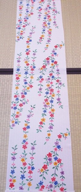 縮緬生地にしだれ桜がカラフルに染められた、可愛らしい小紋です。白地ですが、もちろんこの色は染められた白!!春が来るのが楽しみになる一枚ですよ。