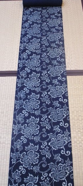 紬生地に華唐草柄の型を置き藍で染めたきりっと着こなして頂けるお着物です。色を多く使わないことで、お洋服の方が多くても浮くことなく、それでいて深い藍の色と大き目な花唐草の柄でエレガントさを出して頂く事が出来ます。