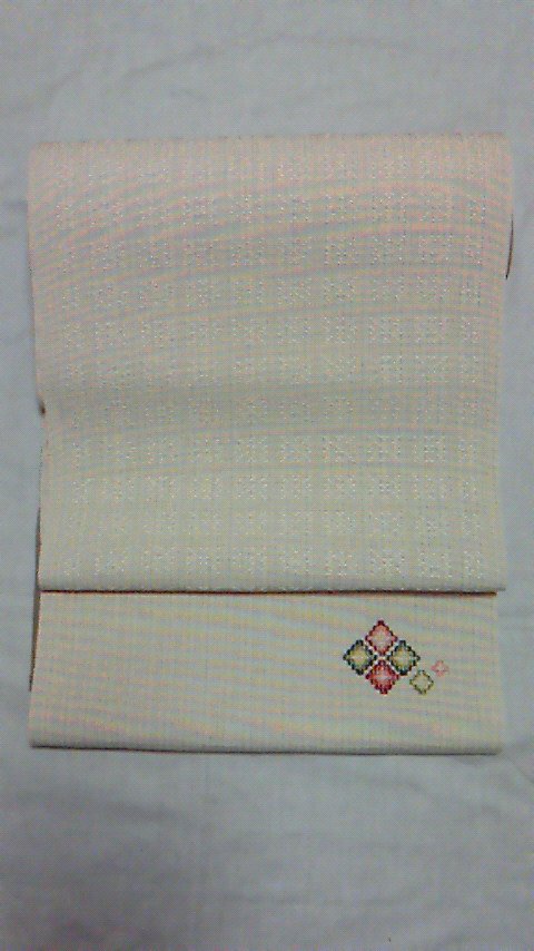 この首里花織の八寸帯は、比嘉浩子さんが織られた物で、紙布が織り込まれています。とてもハリのある帯で、締めやすいですよ。写真では、すこし分かりづらいですが、模様は、柔らかな白地に縞模様と紋織りで花模様が織り込まれています。たれ先に織り出された、色を入れての花織がが、とても可愛らしいです。