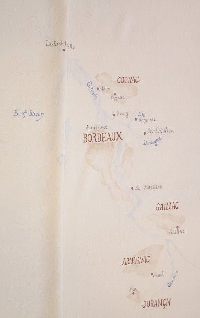 フランスのワインの産地をピックアップして、地図をパステル画のような雰囲気で描いています。