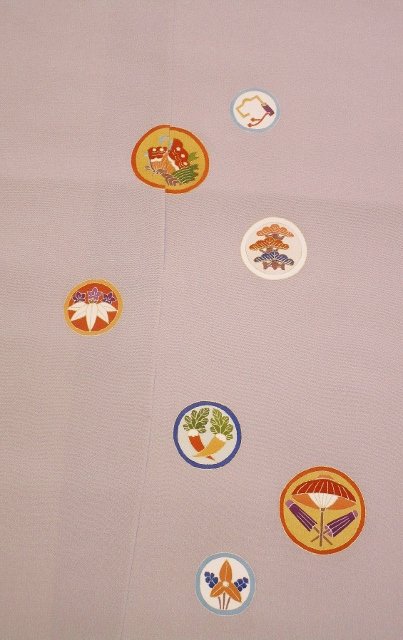 今日ご紹介するのは、狂言の丸模様の付下げです☆縮緬地に上品な友禅で仕上げています。丸紋の中には、吉祥柄が詰まっています。