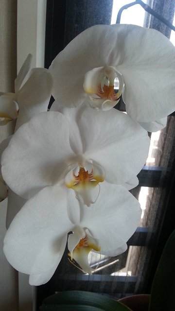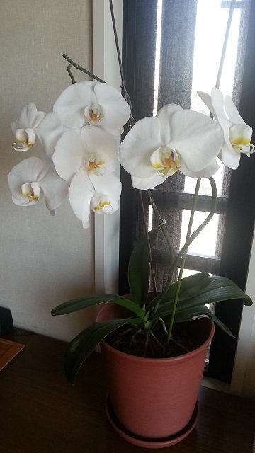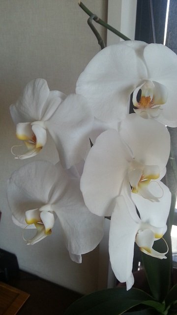 この胡蝶蘭はお祝いに頂いたもので、咲き終わったあと、プー店長さんのお家に持って行き、株を分けて植え替えたうちの一本が綺麗に咲いてくれました。