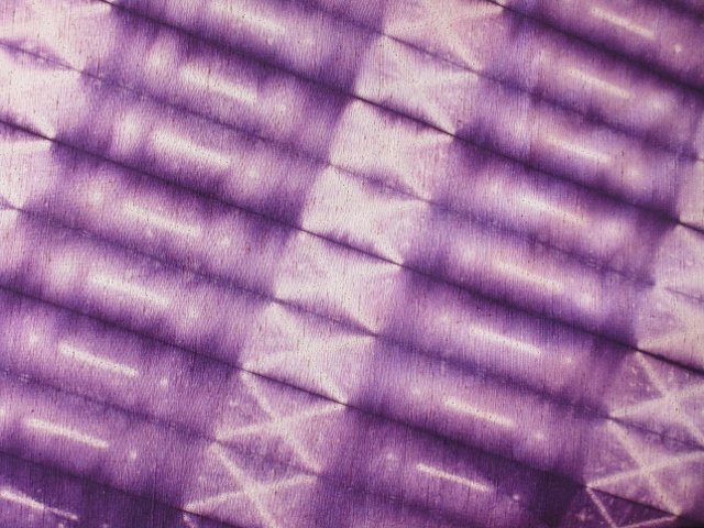 実際にまとって頂くと、絞りの雰囲気ある色のにじみとぜんまい紬の節感がキラキラと光っている様に見えてきます。なので、紫切子グラスの様に見えたり、今ノーベル賞で話題のカミオカンデのように見えたり、引きこまれてしまう一枚です。