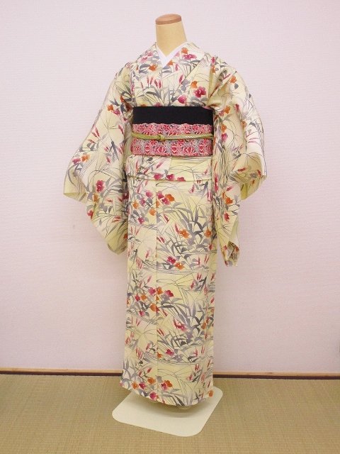 日本の原風景を感じられる心温まる雰囲気ある小紋です。この小紋は型絵と言いつつも、色差しは手差しなので、それぞれの場所でニュアンスの違うぼかしや色の具合があり、奥行きのある上がりになっています。