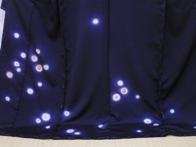 深みのある濃紺地(少しだけ紫味があります)に、ホタルぼかしのように丸く抜いた中にベネチアングラスをモチーフにした模様を、刺繍と友禅で描いています。