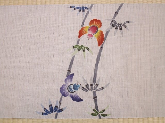 絽麻生地に、竹にふくら雀柄の名古屋帯です。
