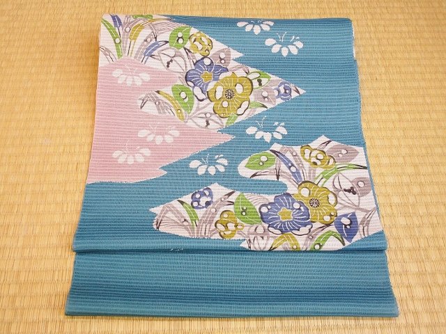 綺麗なブルーの地色に辻が花模様がやさしい印象です。生地は大島紬の糸を使って織った変わり絽で、とても軽く暑い夏に締めても体が楽チンです。夏の織物はもちろん、小紋など柔らか物にも上品にお締め頂けます。時期としては、6月の単衣、7月、8月の盛夏の時期にお使いいただく帯になります