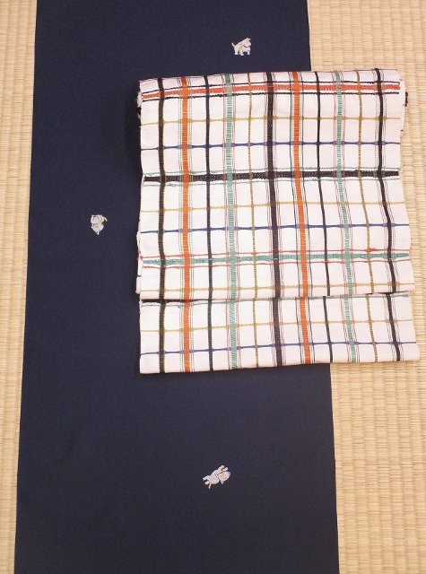合わせた帯は吉野間道の帯です。立体感のある独特の雰囲気が、古典柄でありながらも可愛らしく、ブルテリア柄のお召しをおしゃれに見せてくれます。
