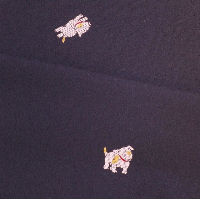 着物は西陣の縫い取りお召で、柄がなんと〝ブルテリア〟織でこんな可愛く表現できちゃうなんてびっくりです。着物の上を飛んだり跳ねたり遊びまわっています。