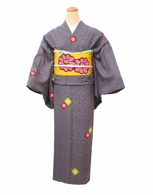 天蚕糸の入った三寿織地に、菱模様を絞った小紋に、三つ菊の絞りの名古屋帯を合わせています。黄色地に赤の菊がとても映えます。小物も1月号に相応しく華やかです♪