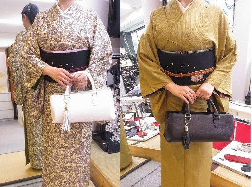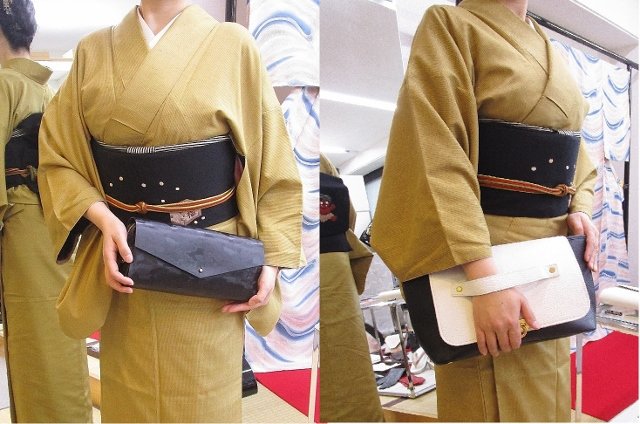 最初の写真の2点は利休バッグ(豊富風です)。次の写真の左が甲冑クラッチ、右が古都バッグ(チェーンが付いているので、お洋服の時は肩からかけてお使いいただけますよ)です。