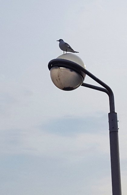 〝橋の欄干に仲良く並んでお休みしている鳥さん達と、街灯の上にたたずむように一羽の鳥さんが〟