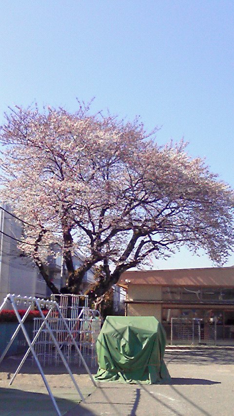私も、駅前の桜をパチリ!と言いたいところが、駅前の桜はまだ、パラパラだったので、保育園の園内にどーんと立っている桜の木をパチリです。どちらも、さんさんと太陽が降り注いでいる場所なのに、歩いて2,3分の距離でこんなに咲くスピードが違うのにびっくりです!!