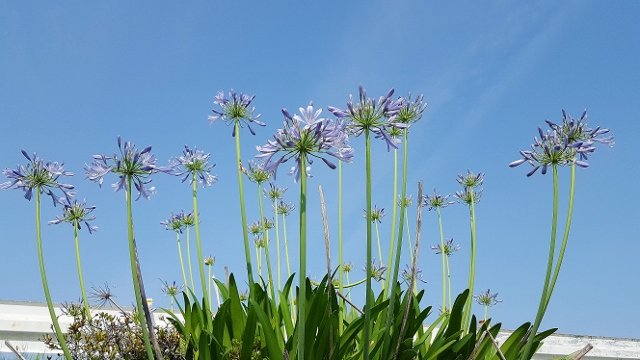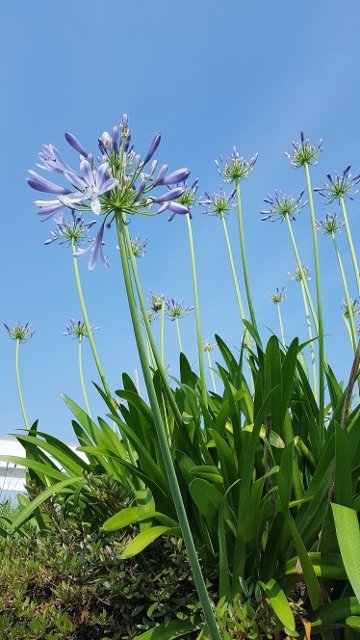 昨日のどしゃ降りから一転、ピッカピカの梅雨の晴れ間のプーさん店長さんとりきちゃん、ぎんちゃんのお散歩から届いた写真は、この季節と言えば〝アガパンサス〟です。