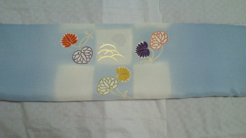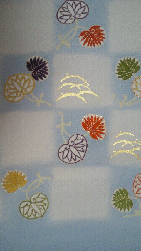 ぼかし市松にさわやかな水色とクリーム色で染められた塩瀬地に葵と露芝が可愛らしく飛んでいます。葵は友禅と刺繍と金駒刺繍で、カラフルに描かれています。露芝は、上品な金箔であしらわれています。