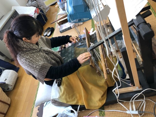 乾燥すると糸が切れてしまうので、この雪の積もった空気感が良いと言うう事で、窓を開けての作業なので、厚着をして、電気毛布をかけていらっしゃいました。