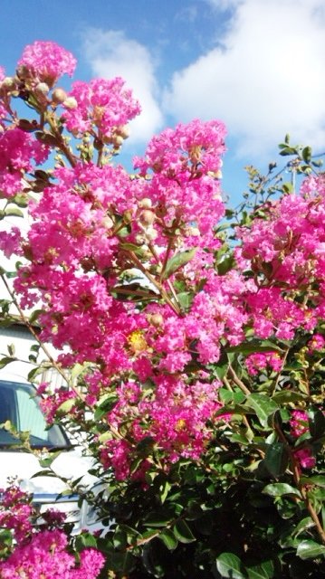 夏でも、プーさん店長さんとりきちゃん、ぎんちゃんはお散歩に出掛けますよ♪今日届いた写真は〝さるすべり〟です。青空と白い雲をバックにピンクのお花が綺麗に咲いています!!
