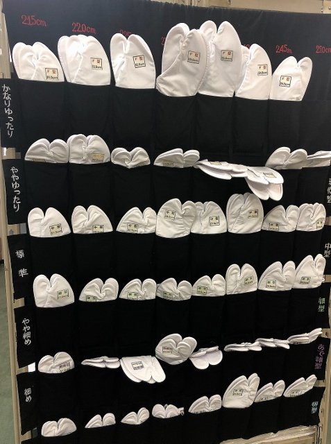 和装小物は、かなり細目からかなりゆったりまでの6種類の足型、21.5㎝から25cmまでの5mmきざみの見本足袋をご用意!!履き比べてご自身にピッタリの足袋を見つけて頂けます。今まで思っていた足のサイズが違っていた!!という衝撃があったりするはずです♪
