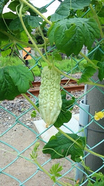 今日届いた写真は小ぶりで可愛らしい〝ゴーヤ〟ちゃんです。線路沿いでかぜにゆらゆらゆれています。