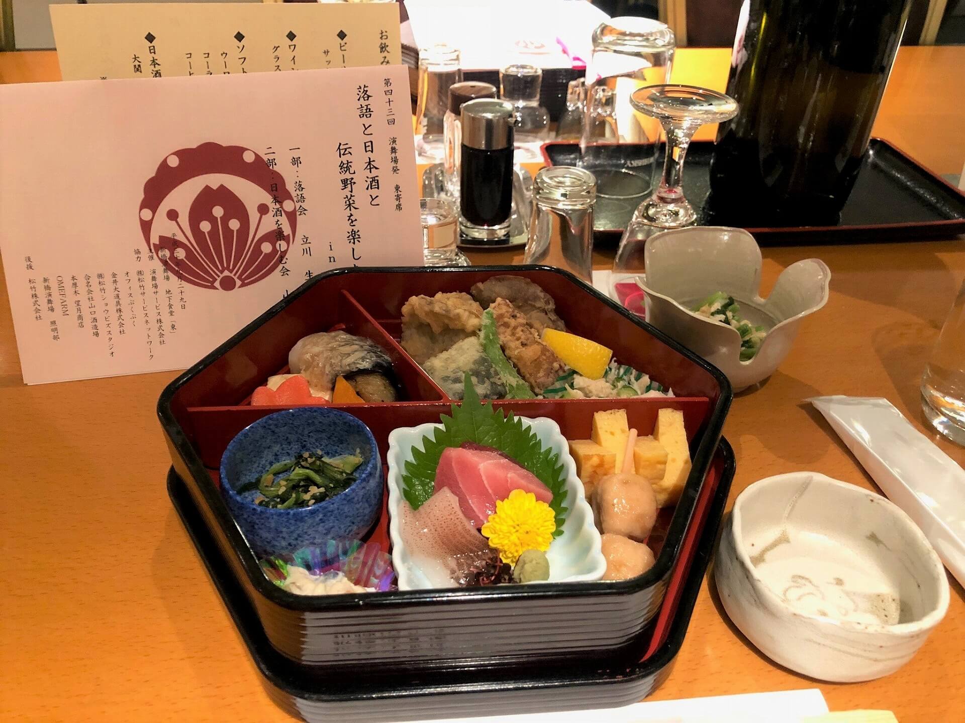 タイトルが『落語と日本酒と伝統野菜を楽しむ会』ということで、山口酒造さんの『庭のうぐいす』の4種類の飲み比べ、美味しいお野菜を使ったお料理のほか、特別献立をいただきました。
